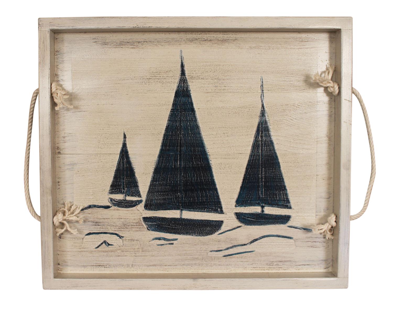 COTTAGE/NAVY 20" WOODEN TRAY WITH 3 SAILBOAT BOTTOM AND ROPE HANDLES